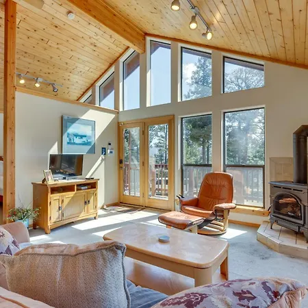 Mtn-View Deck Cabin Getaway In Angel Fire provides guests with the convenience of self-catering amenities, like a kitchen and an outdoor dining area for their enjoyment.